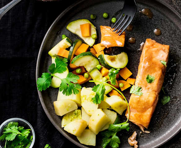 Menu with Ginger-Pea Soup, Lemon Salmon, Broccoli and Potatoes