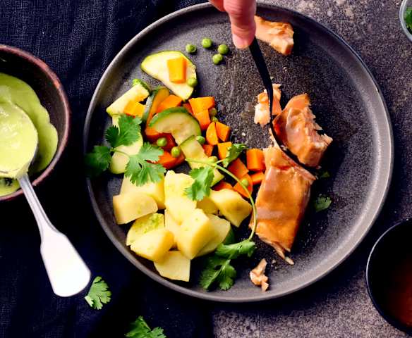 Pea Soup, Lemon Salmon, Broccoli and Potatoes