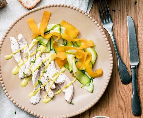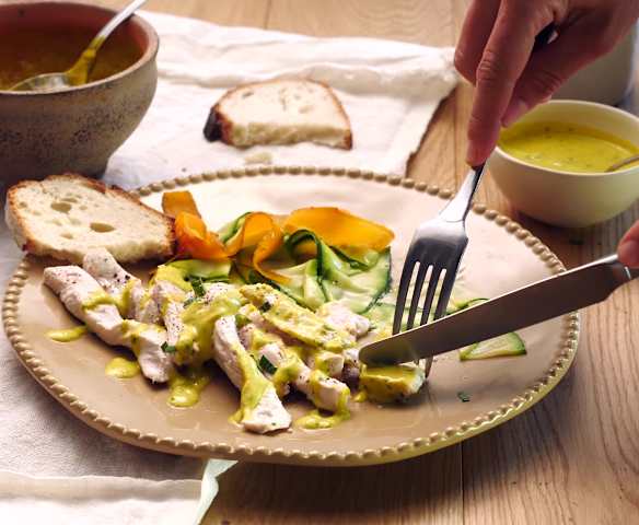 Dinner for 2 - Creamy Vegetable Soup, Steamed Chicken with Vegetable Tagliatelle and Mustard Sauce
