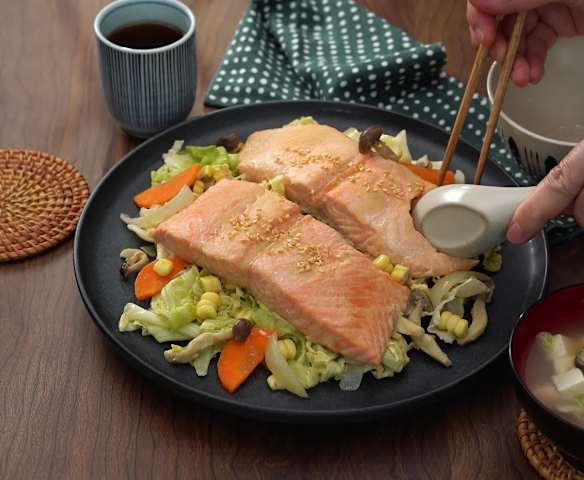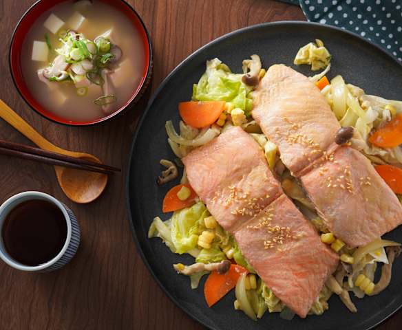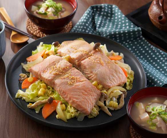 味噌奶油蒸鮭魚和海帶芽豆腐味噌湯