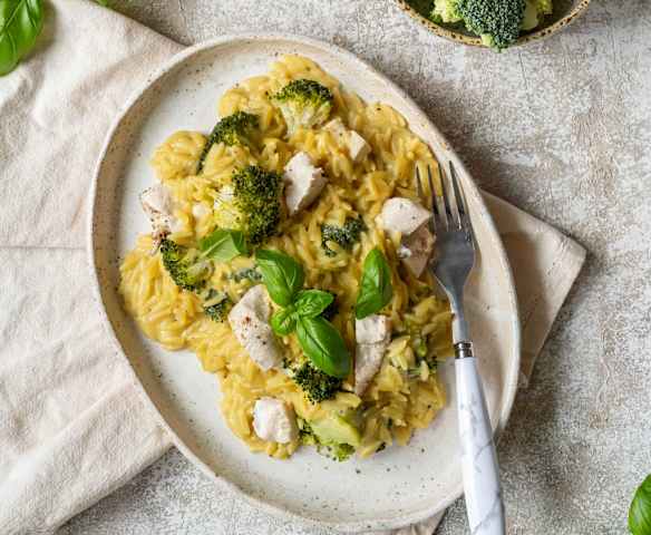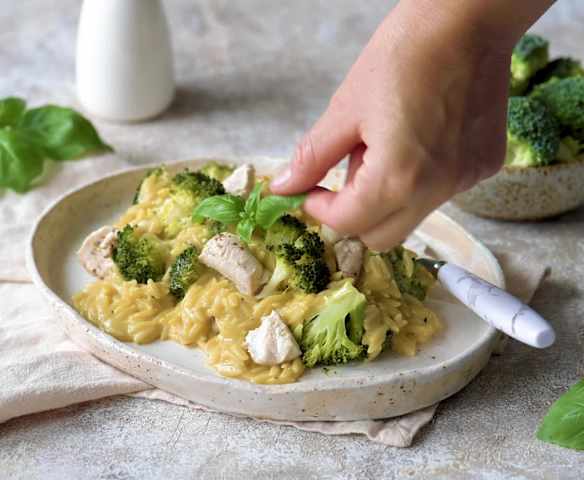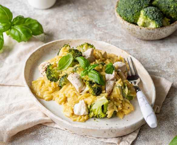 Makaron orzo z kurczakiem i brokułami w sosie musztardowym