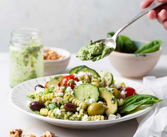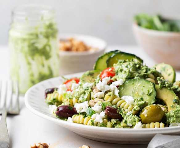 Sałatka z makaronem pełnoziarnistym, łososiem i koperkowym dressingiem