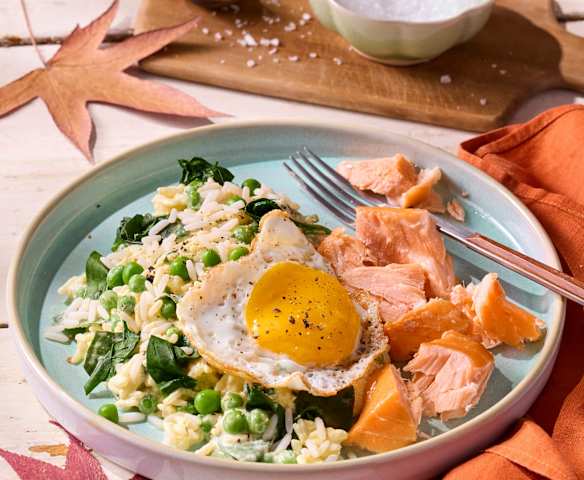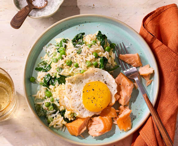 Spinat-Erbsen-Reis mit Lachs und Spiegelei