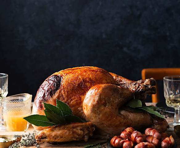 Pavo asado con relleno cremoso de panceta, limón y hierbas