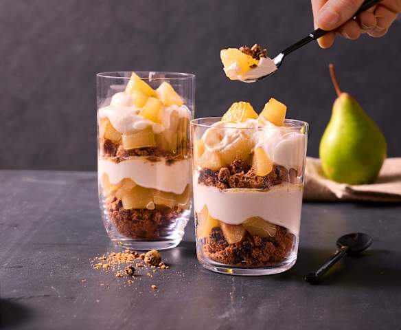 Mascarponecreme mit Butter-Karamell-Birnen und Cookie-Crunch