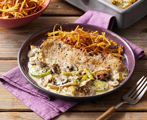Ofenschnitzel mit Champignon-Porree-Sauce