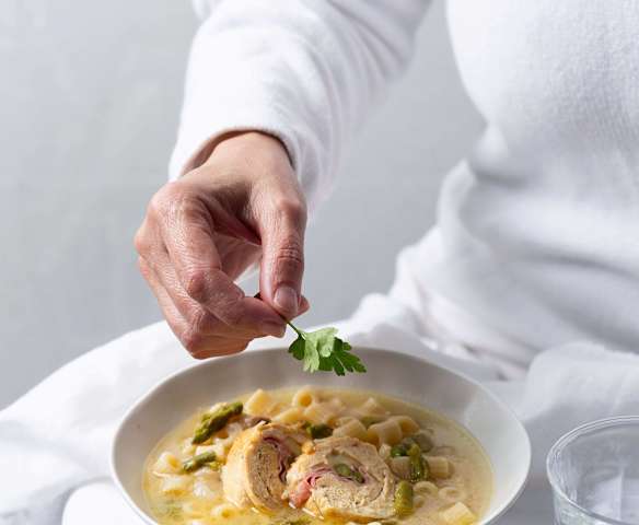 Sopa de pasta con champiñones, espárragos con rollitos de pollo
