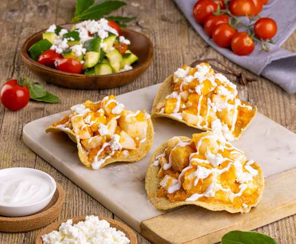 Kebabs de pollo picante con papas curly y ensalada